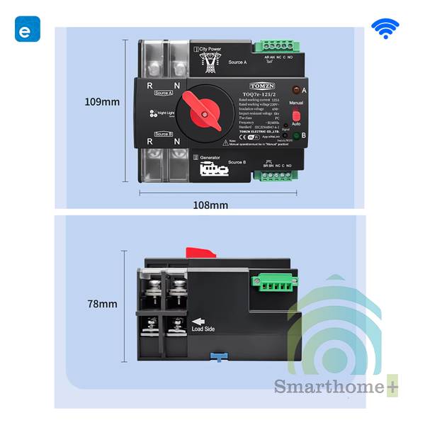 Cầu Dao Đảo Nguồn Tự Động Không Gián Đoạn 1 Pha 63A/100A/125A Wifi eWeLink WF1P
