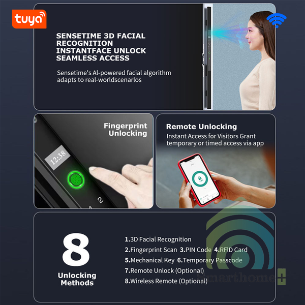 - Mở cửa bằng khuôn mặt 3D, vân tay, mã số, thẻ từ, chìa khóa cơ, app điện thoại.